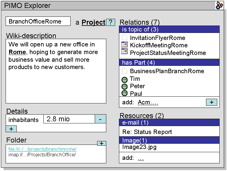 Based on our previous workshops[1] on the topic, and the discussions there with gnowsis end users and developers, we found that several features in personal information management are currently only available on the web and now move to the desktop. Tagging items using keywords is one of those features. It was requested again and again in end-user interviews and looking at related desktop and web products. A similar feature that is also relevant is the integration with existing folder and file hierarchies. Existing file folder hierarchies can be used to populate the ontology, these folders say much about the way people organize their mental models. So some parts of a PIMO can be populated automatically by looking at existing file folders, and the file folders are then linked to the created part in the ontology. Similar, structures found in email folders or in flickr tags can be used to generate. If the user has a flickr account or a weblog, the categories and tags can be analysed and linked into the PIMO.
