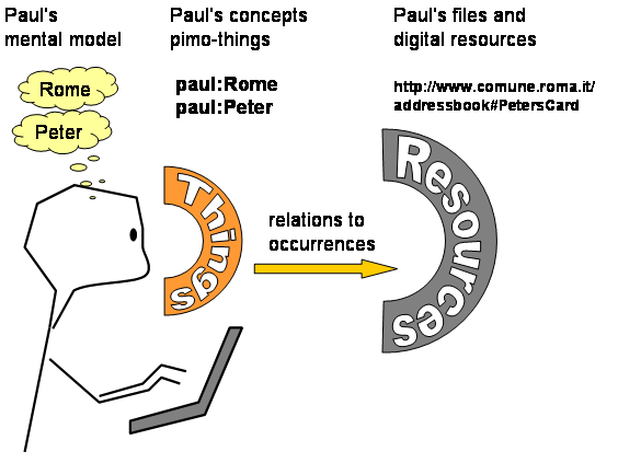 Things and classes of things inside the user's PIMO are identified using URIs from the user's PIMO namespace. These are clearly identifiers for the concepts behind. Refering to the article by Booth, we can say that RDF URIs used to identify instances of pimo:Class, pimo:Thing, and pimo:Slot identify the concept represented by these [Booth2003]. As the URIs in the personal information management domain identify the concept bound to the subjective view of the user, the namespace is bound to the person. We suggested to use Jabber-ids as part of the namespace, they are a technical identification of the user, like an e-mail address. See the section above.