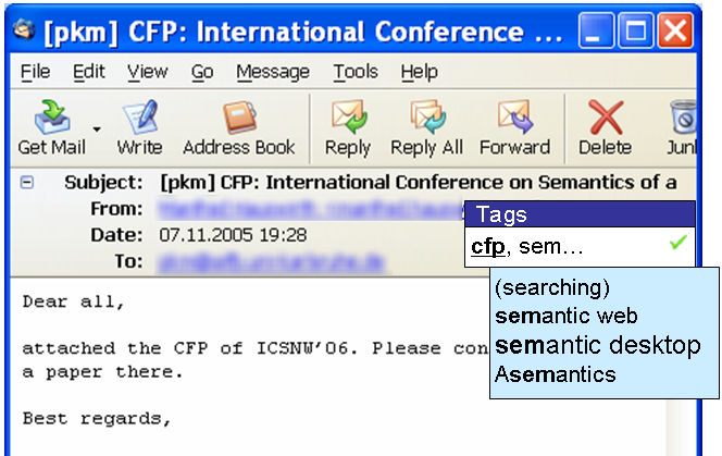 You find a useful name for the tag, like "SemanticDesktop". Then you connect the e-mail to the thing that is named after this tag. This works like this: