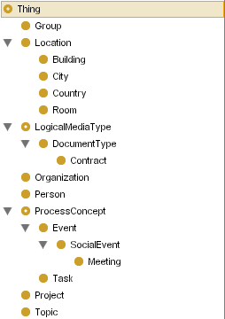 Sometimes, things may be outdated or not needed anymore, but they should remain in the PIMO to be searchable. To do this, the user may hide a thing, class or property. Even the default classes like pimo:Person can be hidden, with an exception: pimo:Thing must not be hidden.