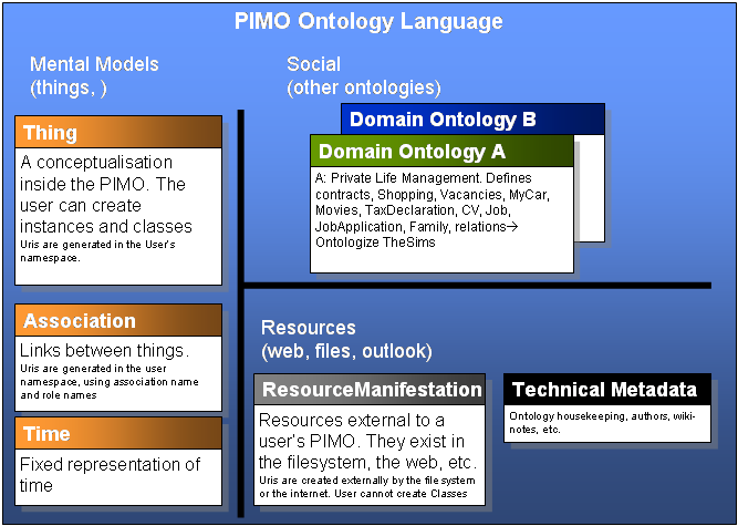 If one of those is missing or failing, the ontology will fail. It is not usable to talk about ontologies only focusing on one level. So the big theory behind is: ontologies only work when describing the meaning behind, the ontology as RDF vocab, example data and code. For PIMO we provide all of them.