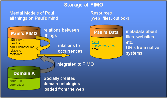 For real-life applications (like the gnowsis beta version) we suggest to separate the storage of resources from the storage of the PIMO ontologies. All automatically extracted information about resources (i.e. from a lokal desktop search engine) should be in one store. All hand-crafted or algorithmically created data from the PIMO should be stored in a capable RDF database.
