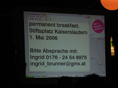 Am ersten Mai 2006 wird am Stiftsplatz gefÃŒrhstÃŒckt. Das ganze ist ein http://www.permanentbreakfast.org/, Anleitung siehe dort.