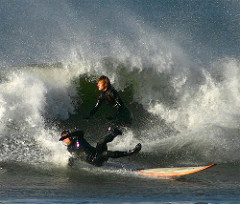 In the graph, we compare two typical people being approached by a deadline which they are going to surf. Orang is the prepared and experienced surfer: when he sees the work coming, he gets on top of it early and then rides it at the bottom of the curve, gaining momentum and keeping the work well behind him. Finally, he elegantly finishes before the deadline and turns his board around, before the whitewater of accusations and last-minute panic crushes him. Not so the blue surfer. He waits a bit too long at the beginning, is taken by work to fast which tips him over. Unable to stay in front of the work, he ends up in the whitewater of accusations and last-minute panic.