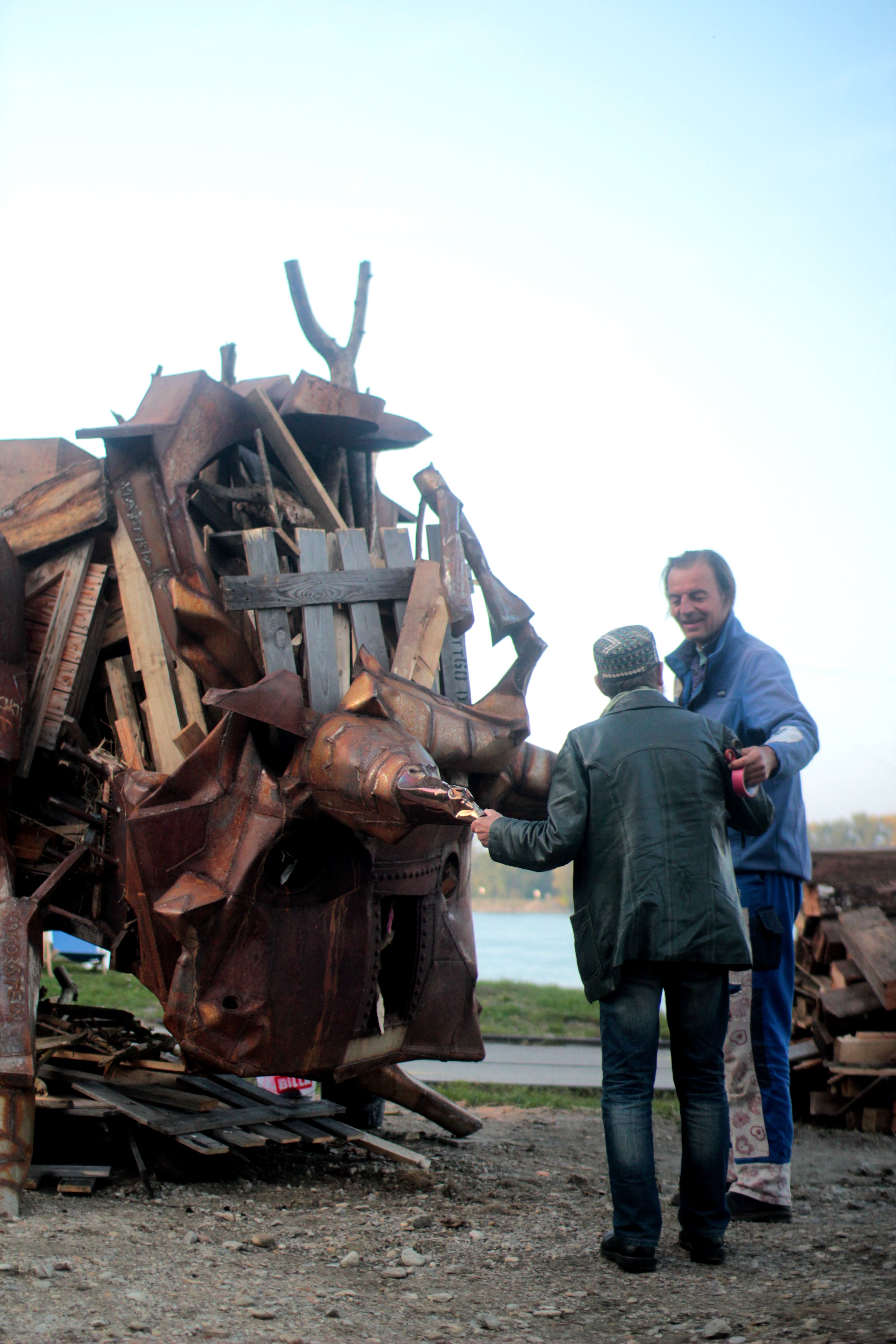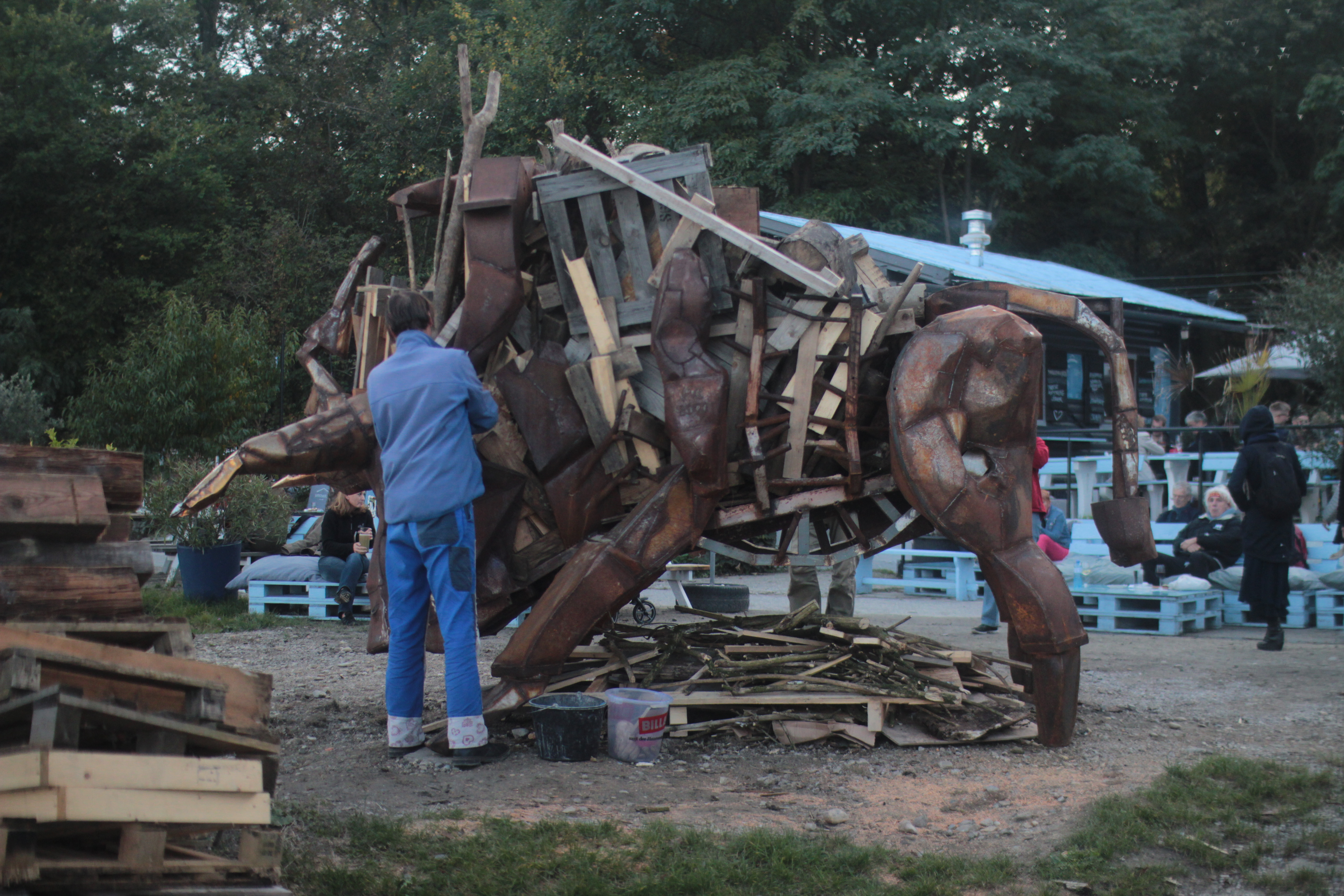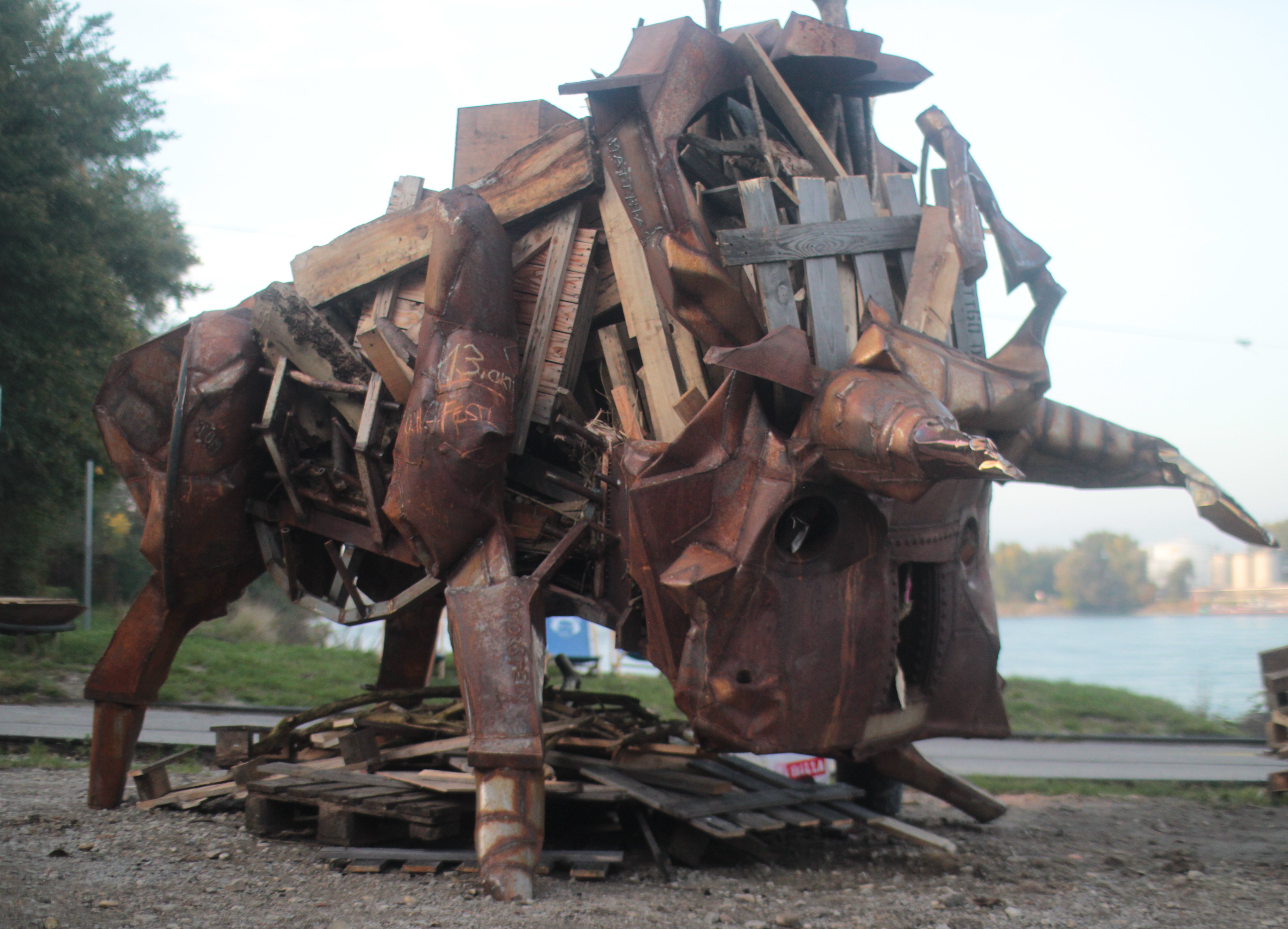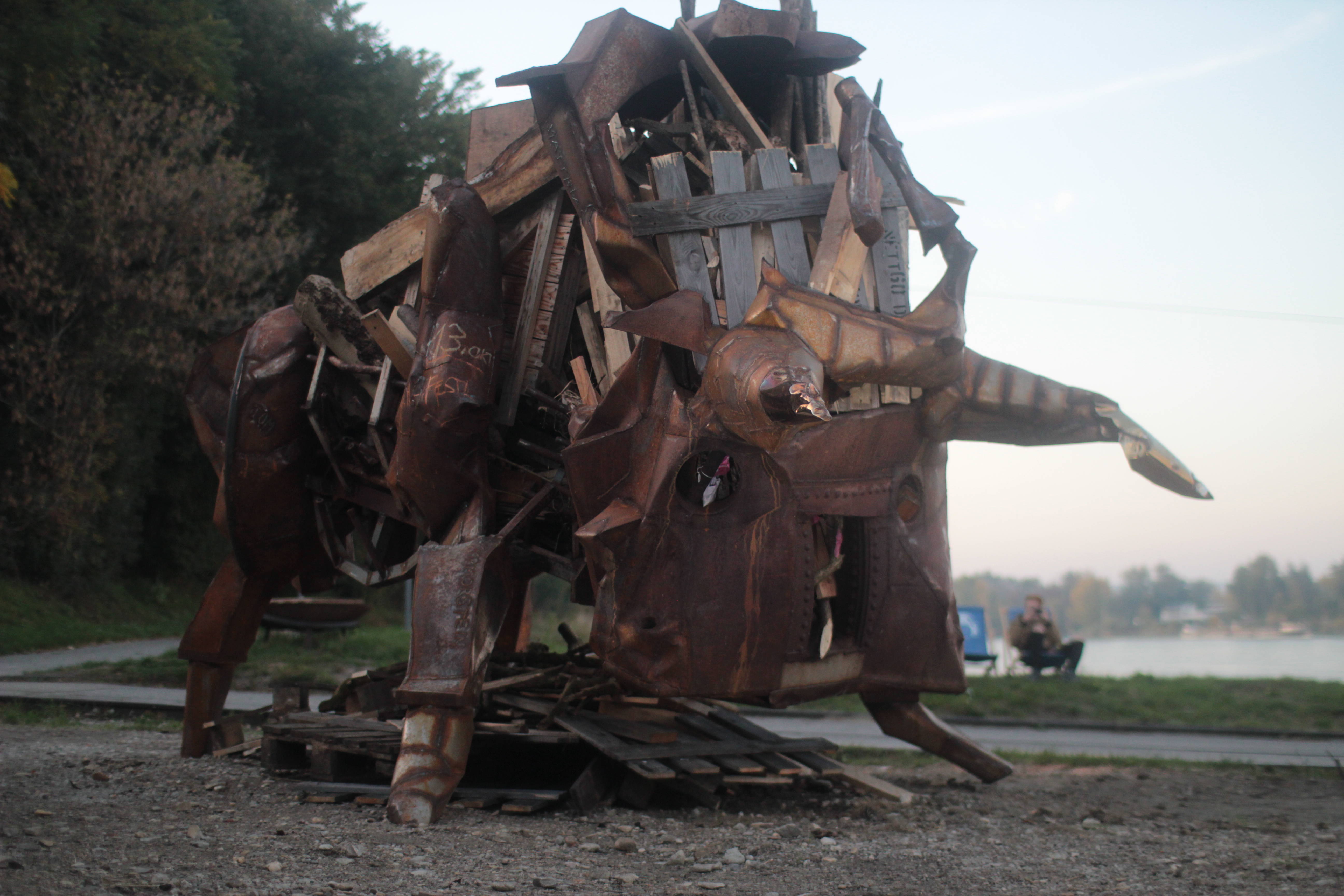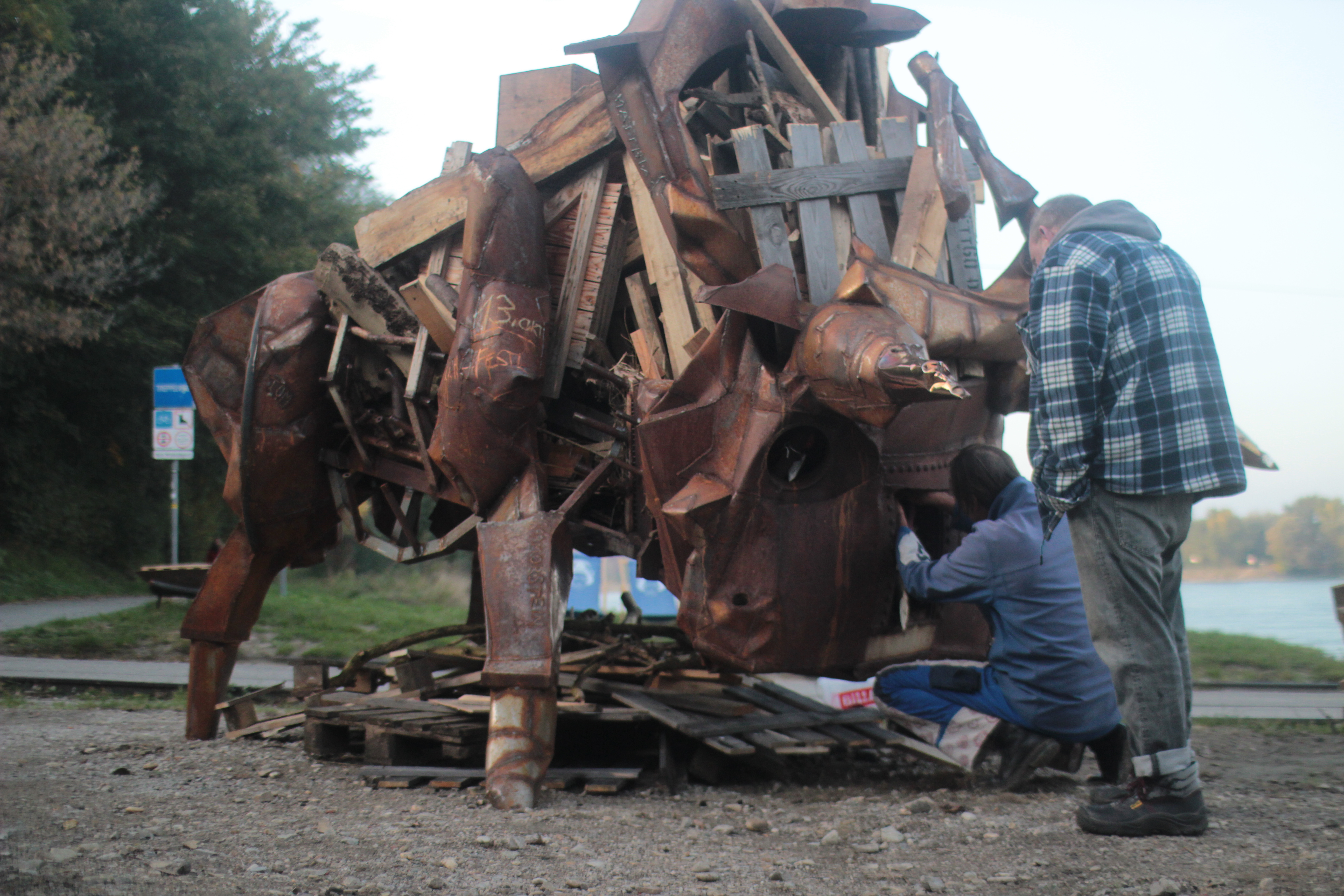 Mad Cow – oder Carnotaurus – ist ein tonnenschwerer Stahl-Bulle, der durch Feuer zum Leben erwacht. Eine Skulptur, geschweißt in über 1500 Stunden Arbeit in den letzten 3 Jahren von Christian “Cricri” Marmorstein aus Weidling. Stark und Intelligent: der Bulle funktioniert als Feuerkorb, in mehreren Schichten Stahlblech gearbeitet, durch Luftströme und Wasser gekühlt, um während des Abbrands stabil zu bleiben. Unterstützung erhielt Cricri beim Transport, bei der Materialbeschaffung und der Installation des Bullen beim Uferhaus in Klosterneuburg. Die Namen einiger Mitstreiter sind auf dem Werk verewigt. Am 13.10.2019 erwachte der Bulle zum Leben. Ich und ein paar andere Burning Man Community Mitglieder aus Österreich waren dabei.
