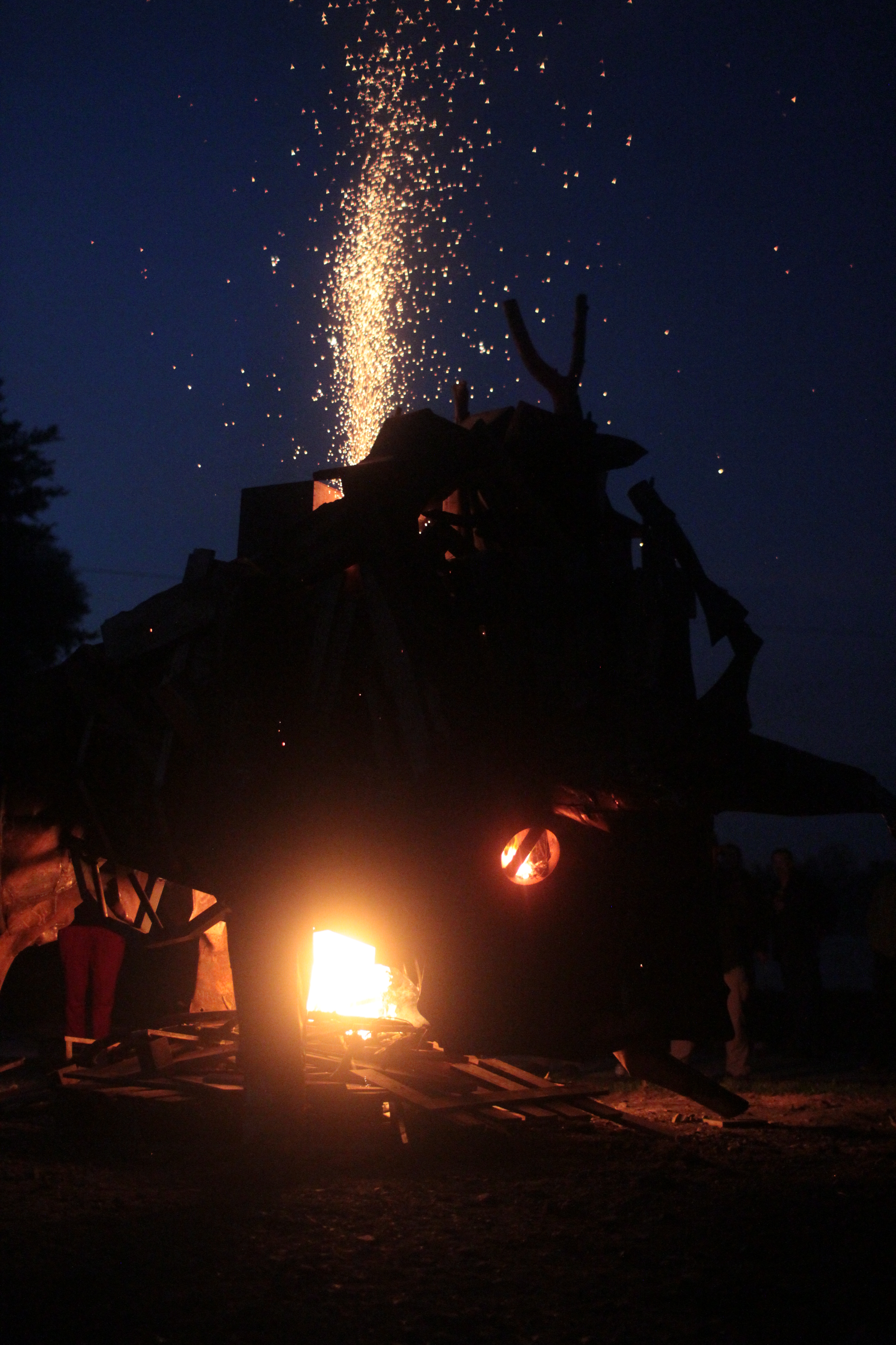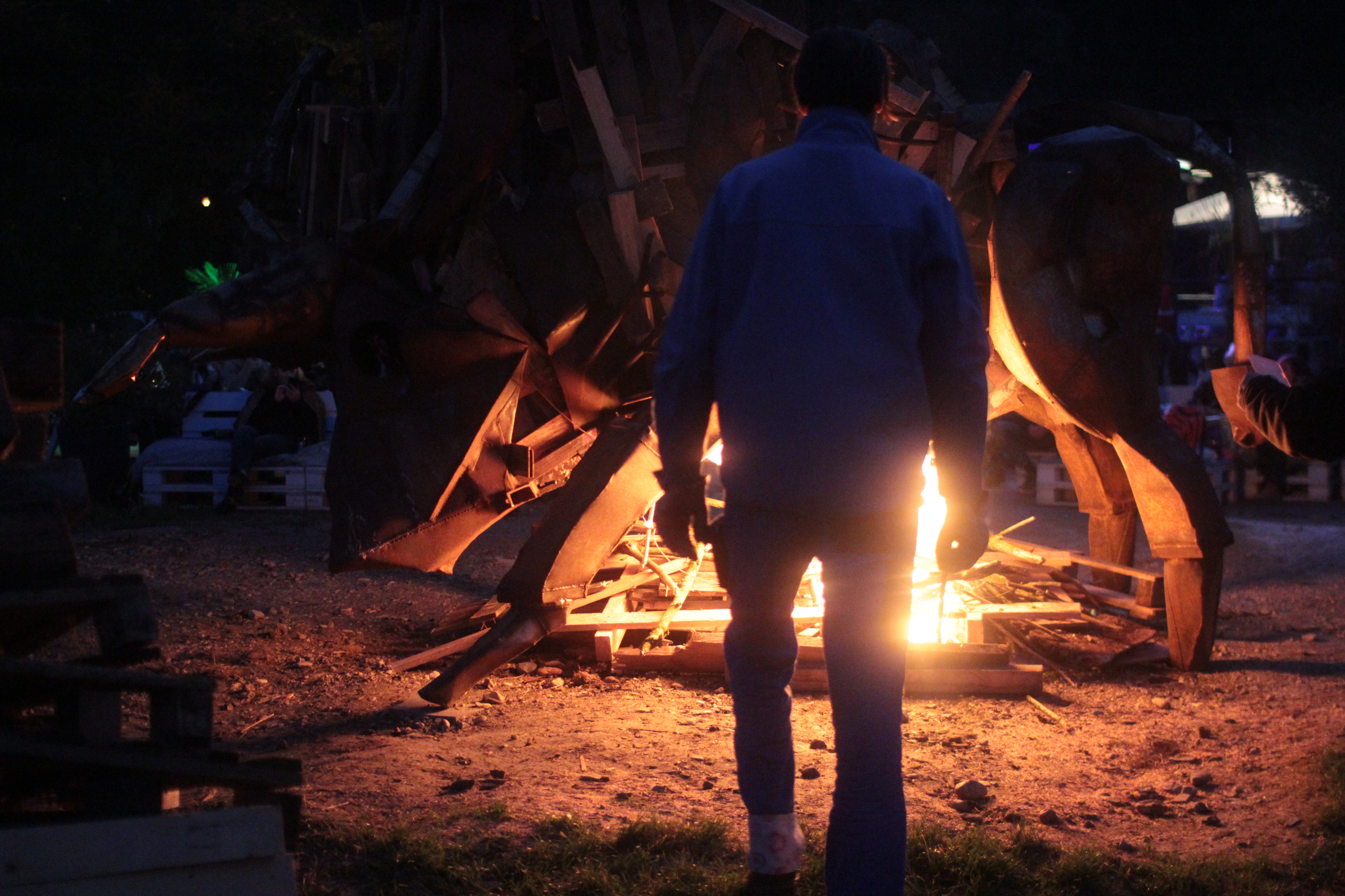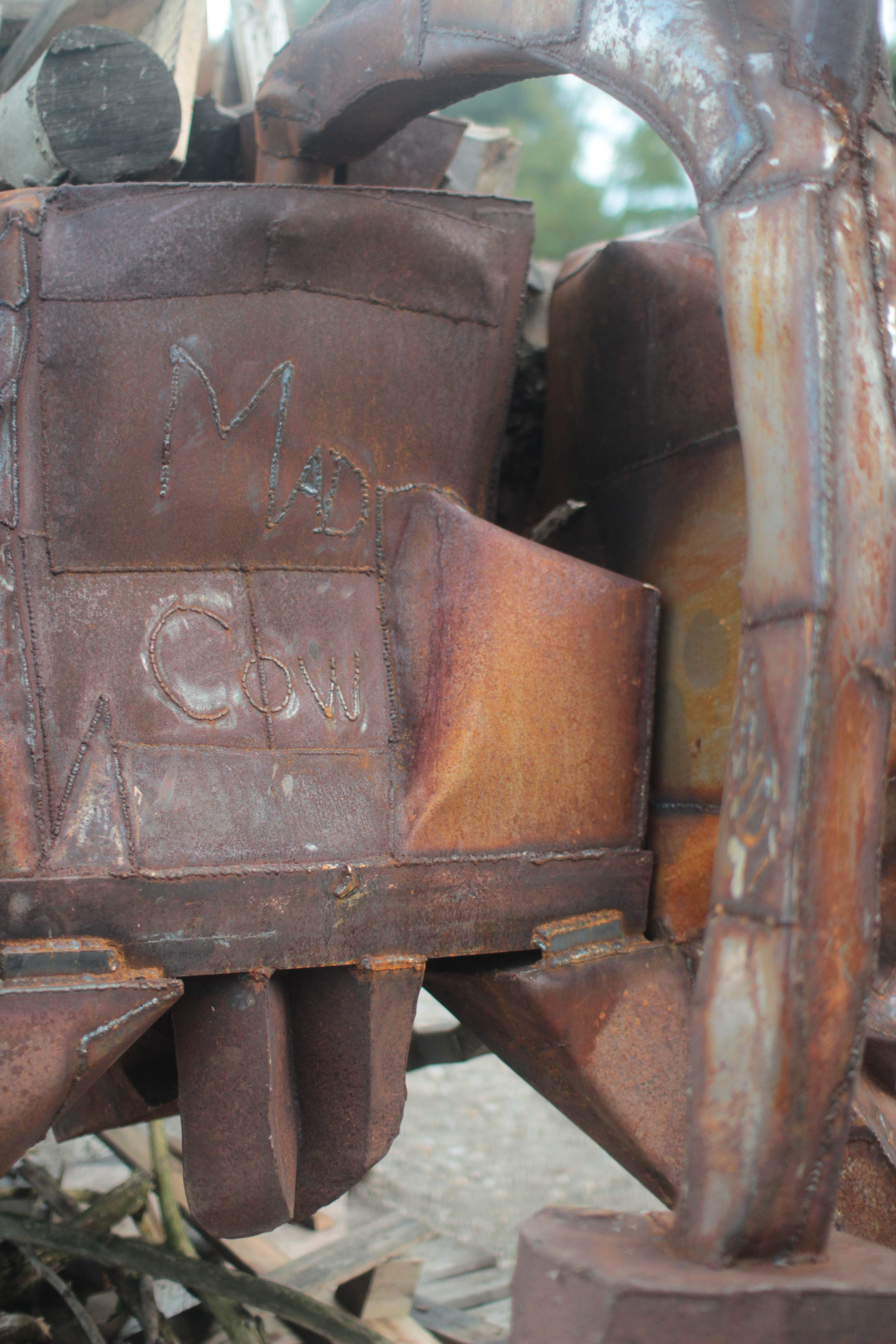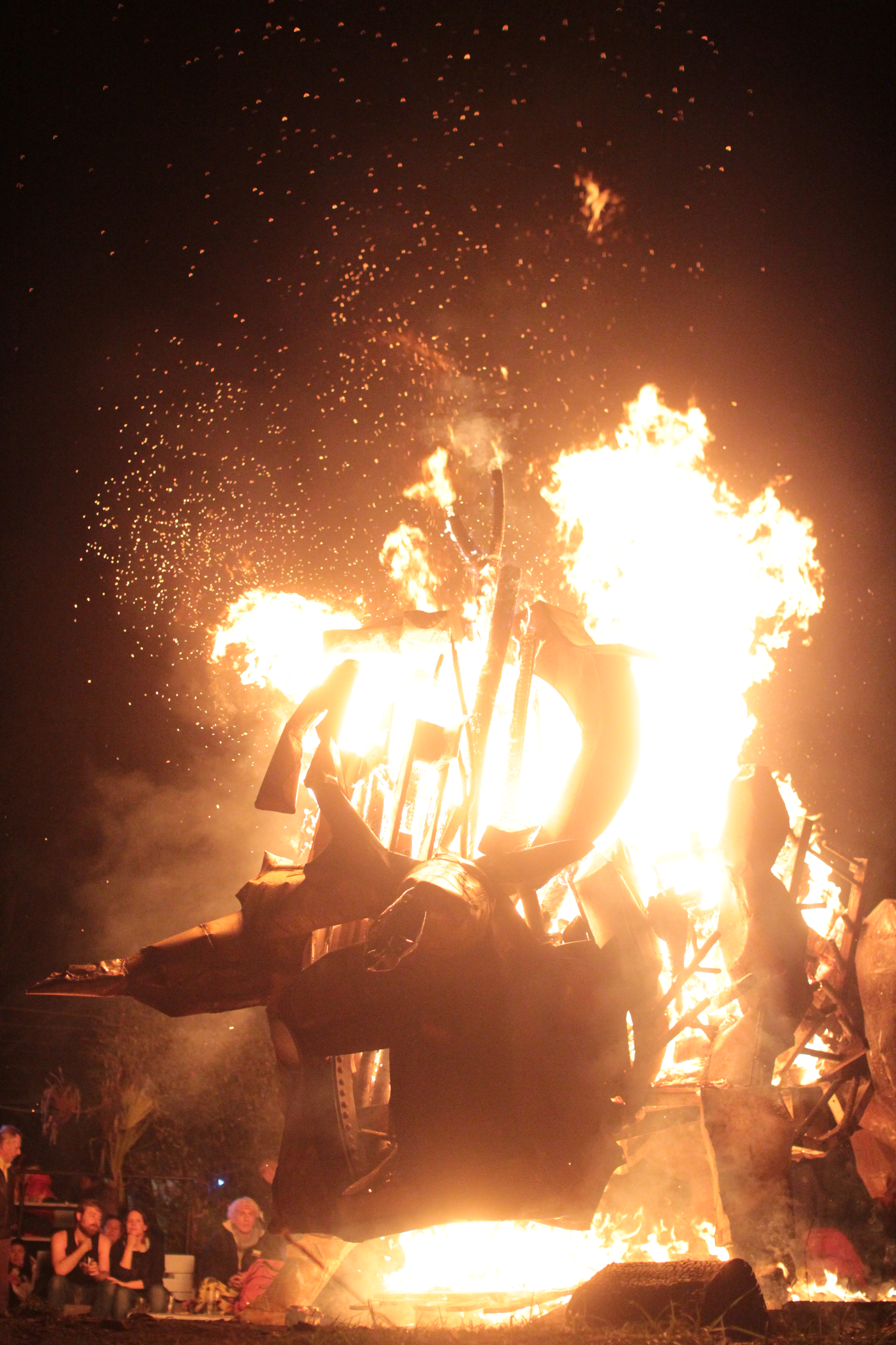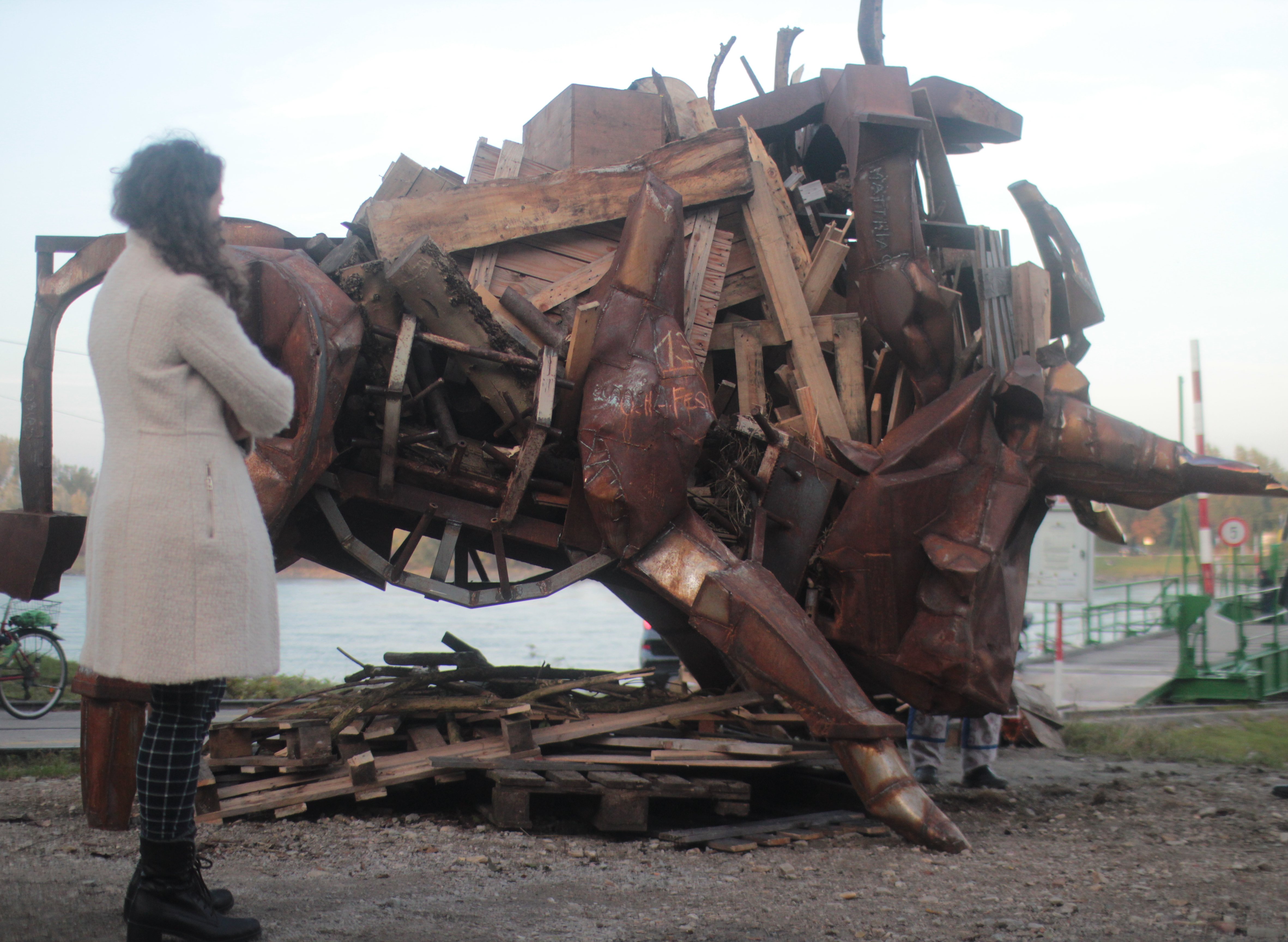 Mad Cow – oder Carnotaurus – ist ein tonnenschwerer Stahl-Bulle, der durch Feuer zum Leben erwacht. Eine Skulptur, geschweißt in über 1500 Stunden Arbeit in den letzten 3 Jahren von Christian “Cricri” Marmorstein aus Weidling. Stark und Intelligent: der Bulle funktioniert als Feuerkorb, in mehreren Schichten Stahlblech gearbeitet, durch Luftströme und Wasser gekühlt, um während des Abbrands stabil zu bleiben. Unterstützung erhielt Cricri beim Transport, bei der Materialbeschaffung und der Installation des Bullen beim Uferhaus in Klosterneuburg. Die Namen einiger Mitstreiter sind auf dem Werk verewigt. Am 13.10.2019 erwachte der Bulle zum Leben. Ich und ein paar andere Burning Man Community Mitglieder aus Österreich waren dabei.