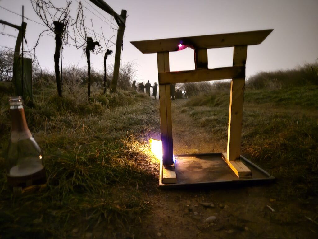 Leo cut into three fingers of his left hand exactly a year ago when working on an art piece for last year’s new year celebration. It was a big cut into his life. Recovery went well, the AKH doctors did magic, no infections. The fingers are writing these lines, but not like before. Life is short. Lesson learned: always take care when operating heavy machinery and diligently follow security protocols. Here is a picture of the artwork that Leo worked on, a model for a Torii Gate for a future burn. It cites the Japanese temple gates separating the mundane from the holy, and the gates Leo made and burned for Erntefestival.